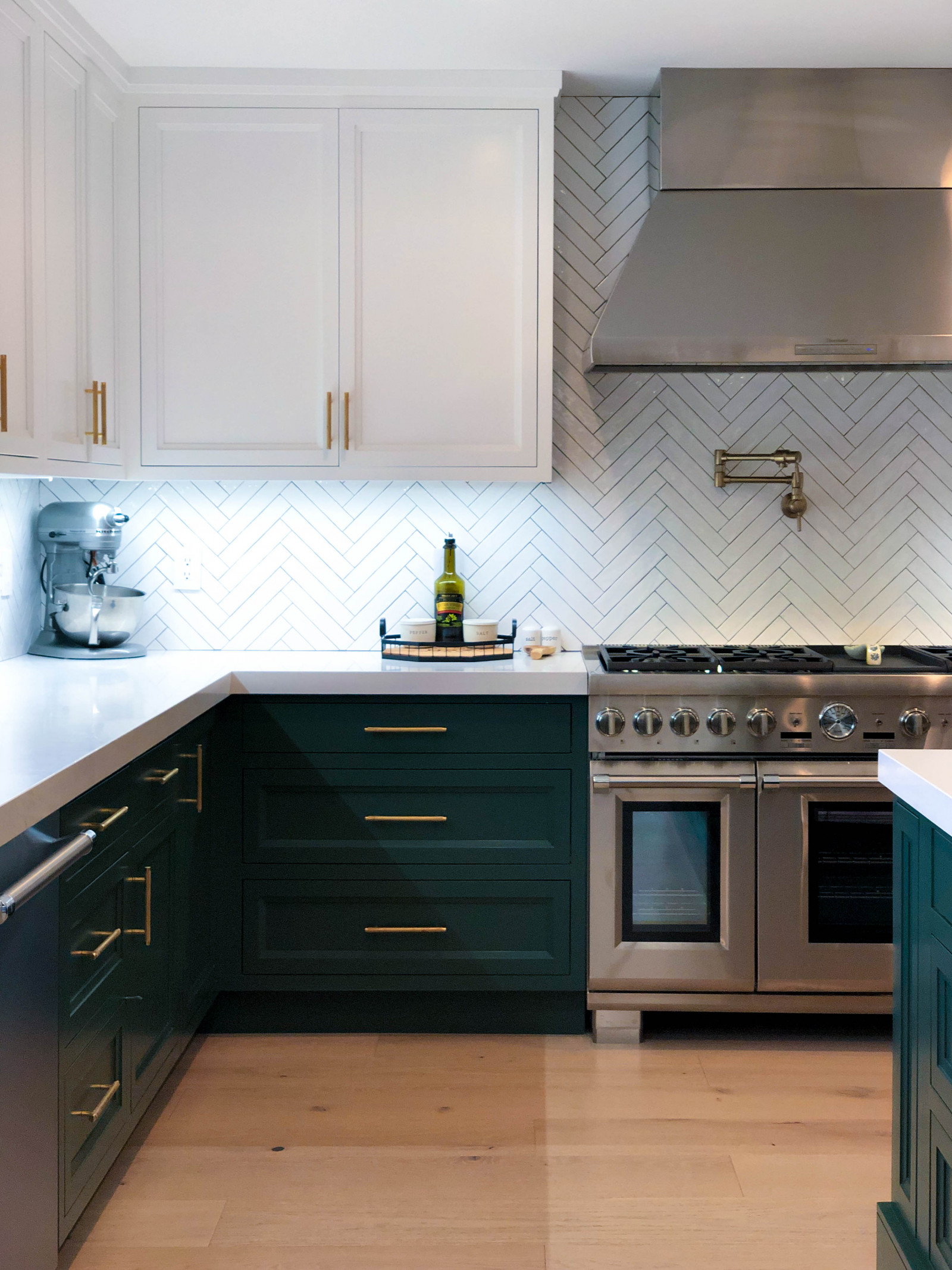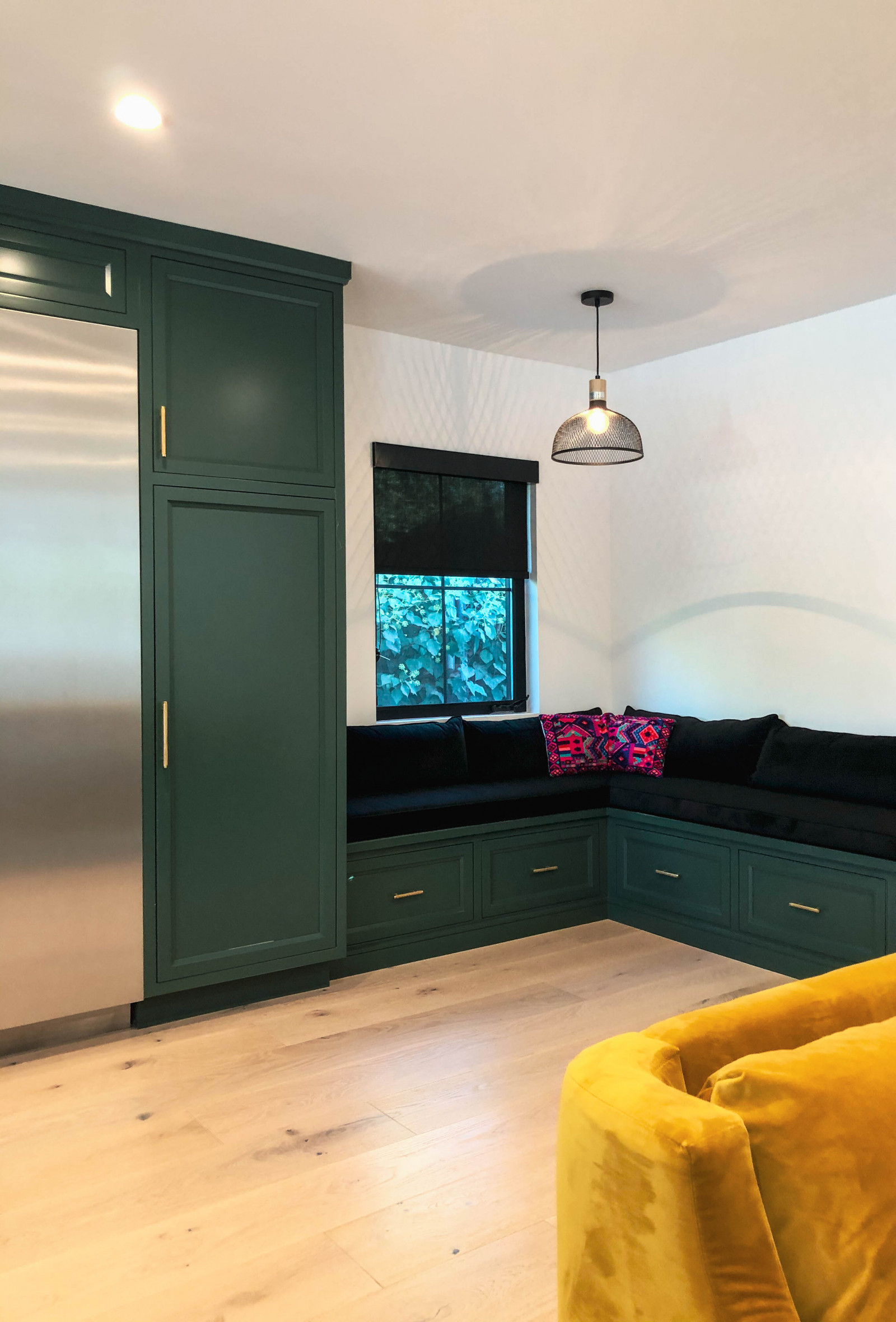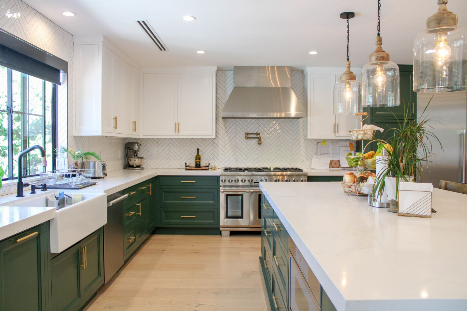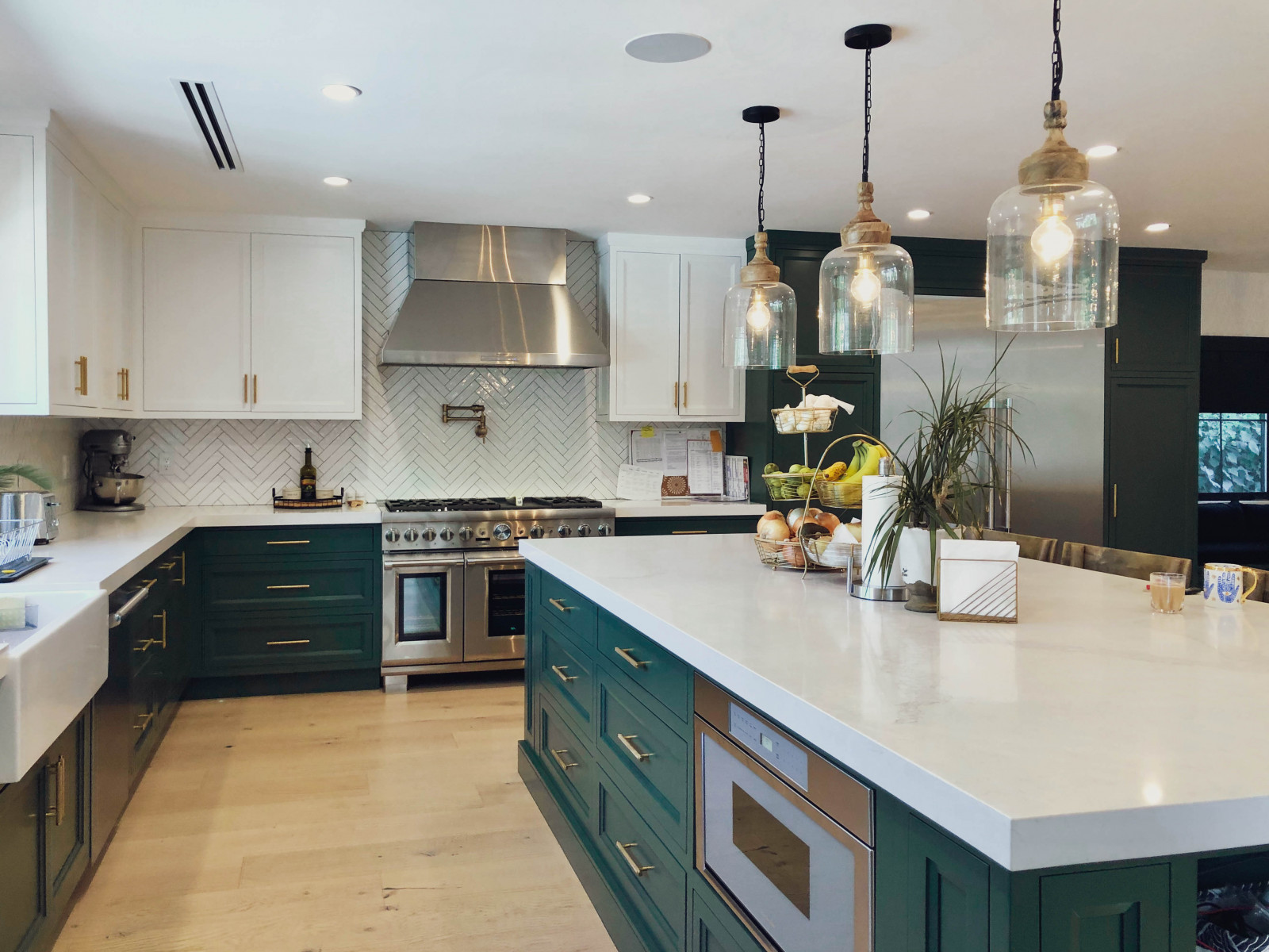 Interior remodel for a home in Los Altos. We installed vinyl flooring, interior paint, wood beams for the high ceilings, and added recess lighting. We installed custom-designed shaker cabinets in the color midnight green with champagne hardware, new vinyl flooring, quartz countertops, herringbone backsplash, recess lighting, a custom island featuring bar seating and additional storage space.