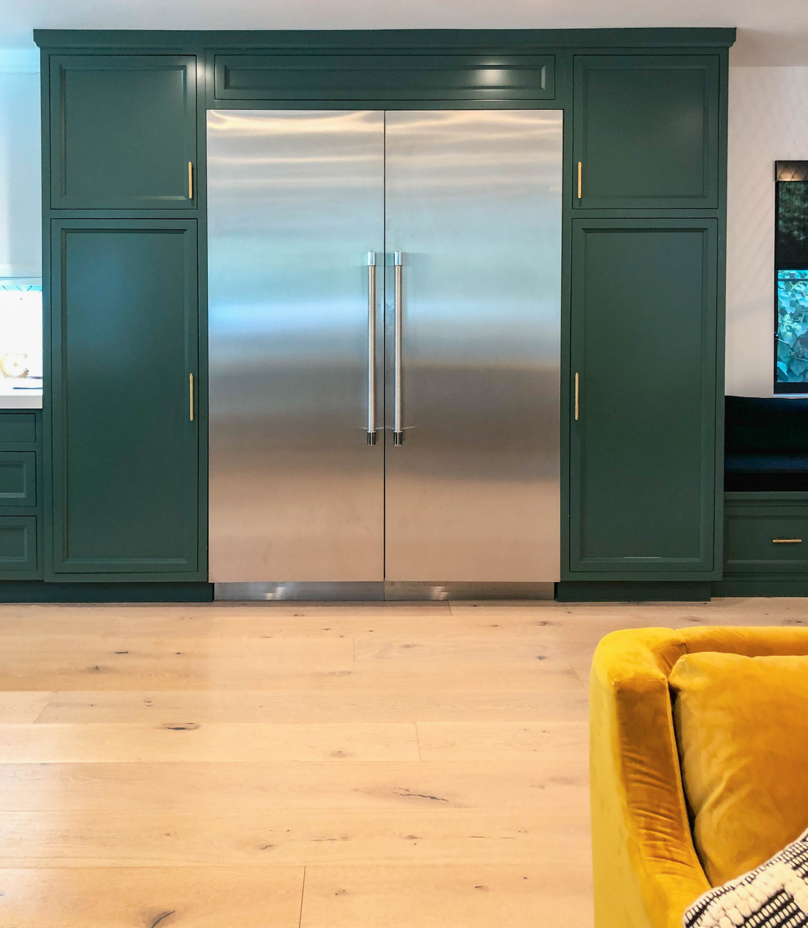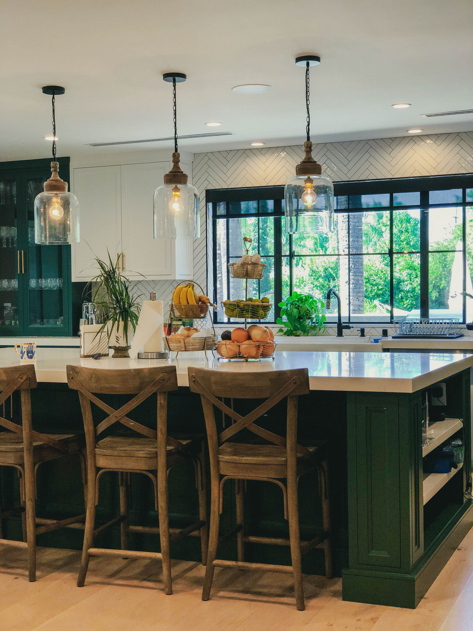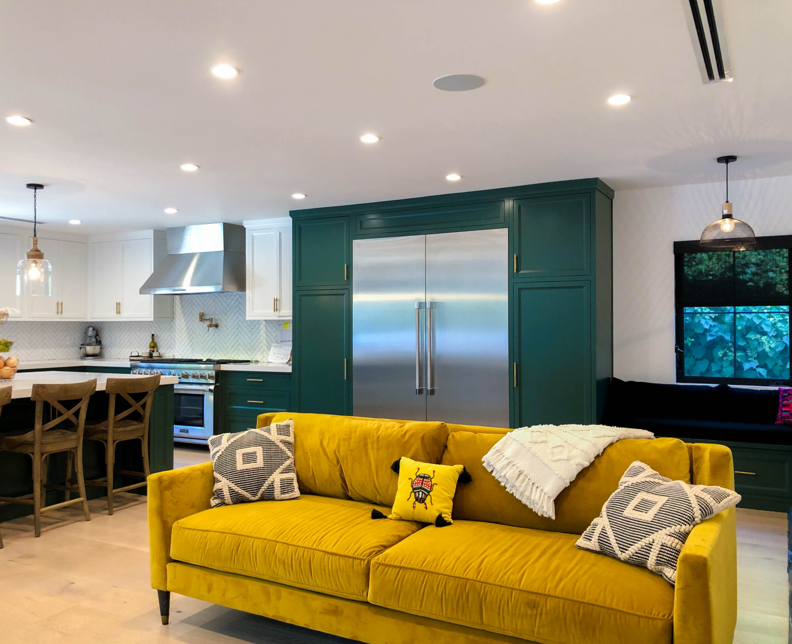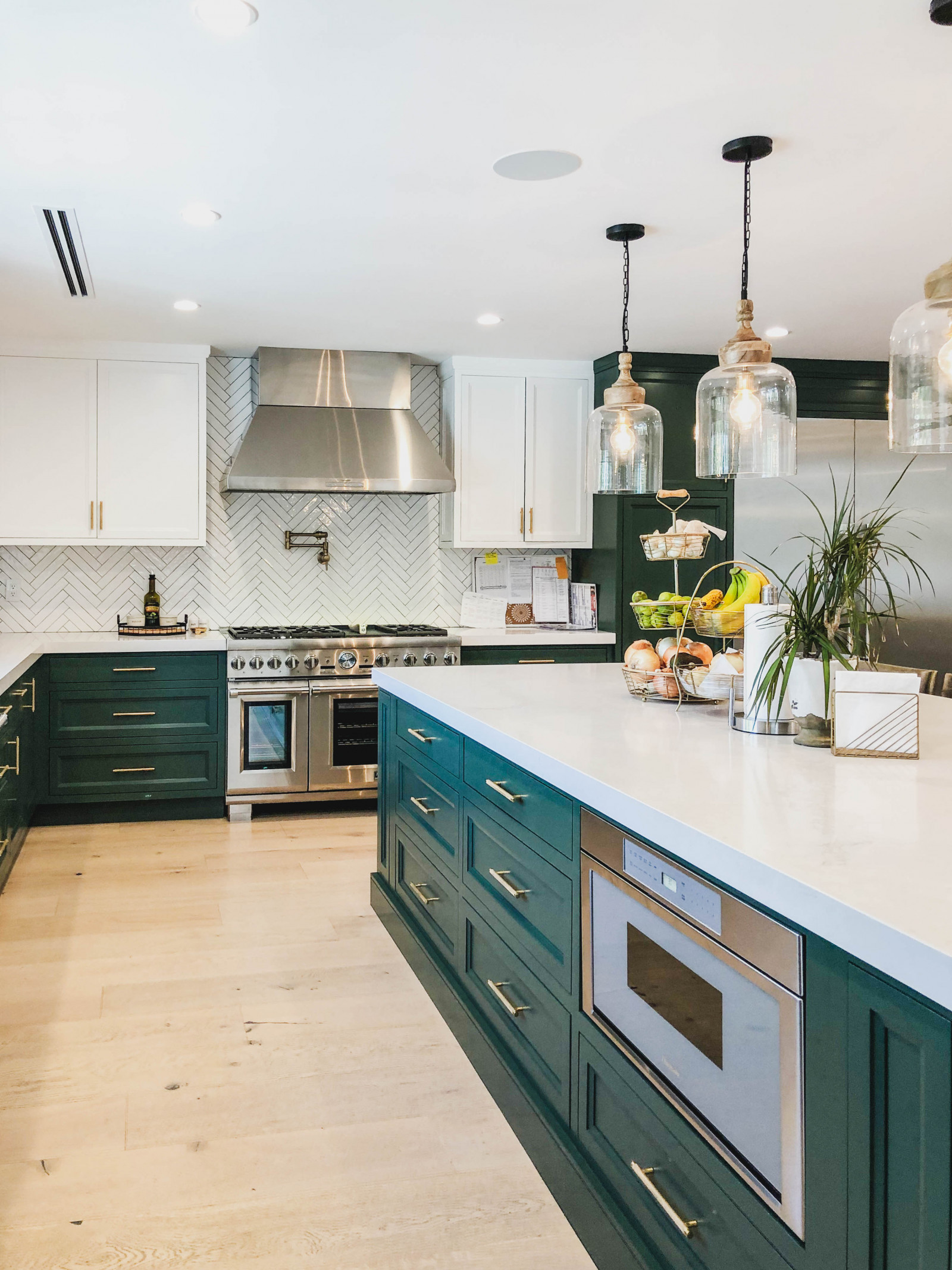 Interior remodel for a home in Los Altos. We installed vinyl flooring, interior paint, wood beams for the high ceilings, and added recess lighting. We installed custom-designed shaker cabinets in the color midnight green with champagne hardware, new vinyl flooring, quartz countertops, herringbone backsplash, recess lighting, a custom island featuring bar seating and additional storage space.