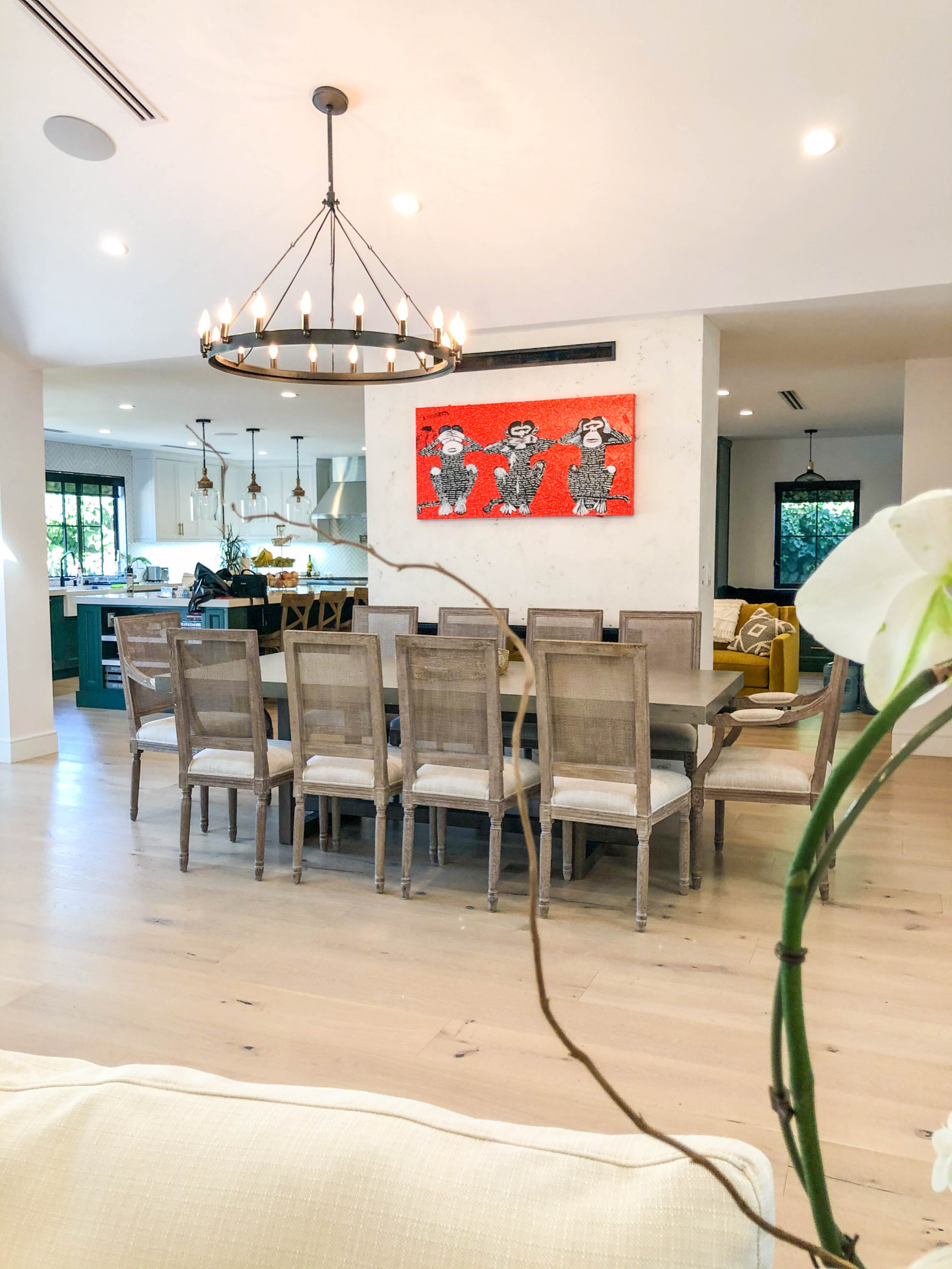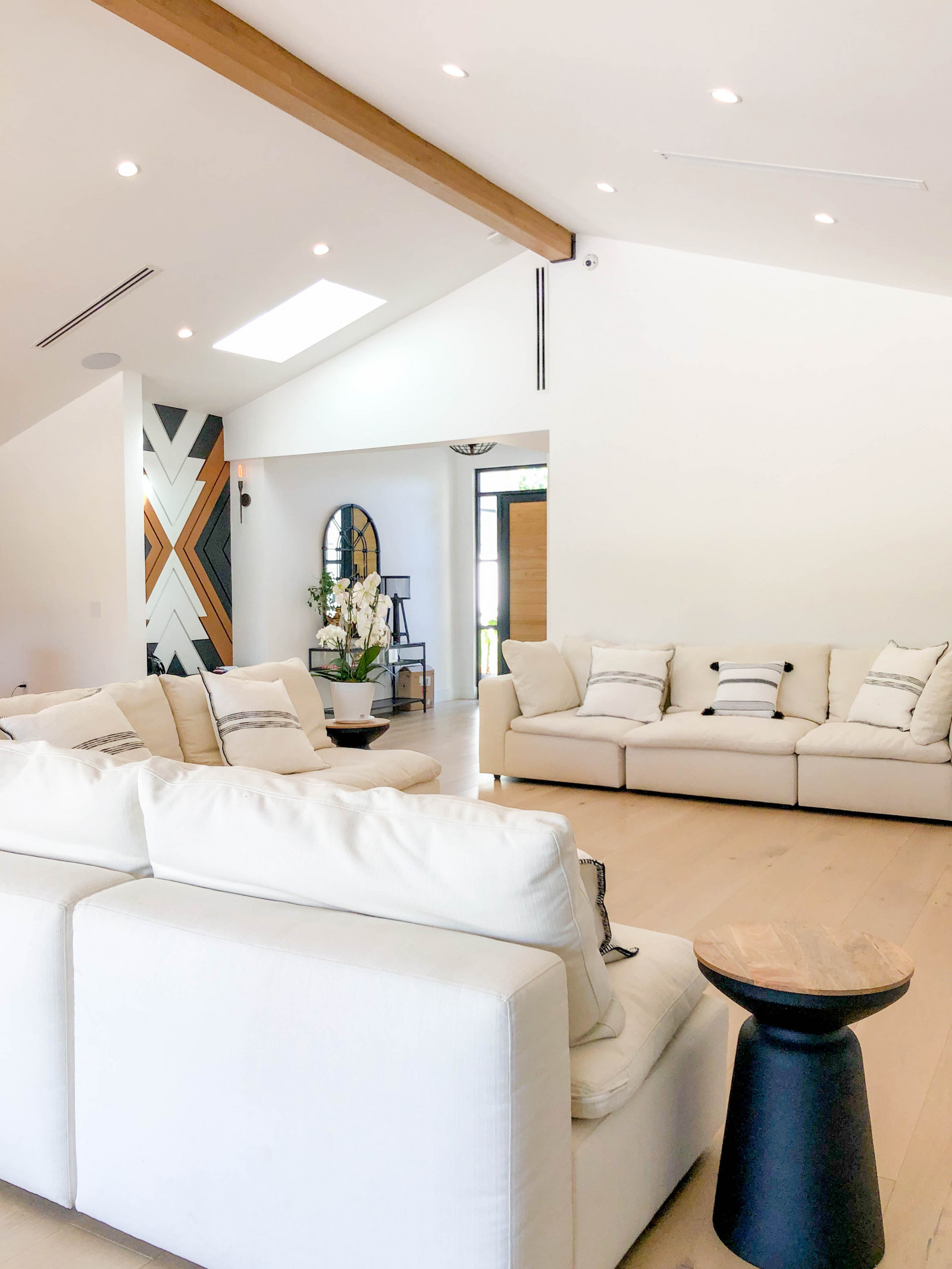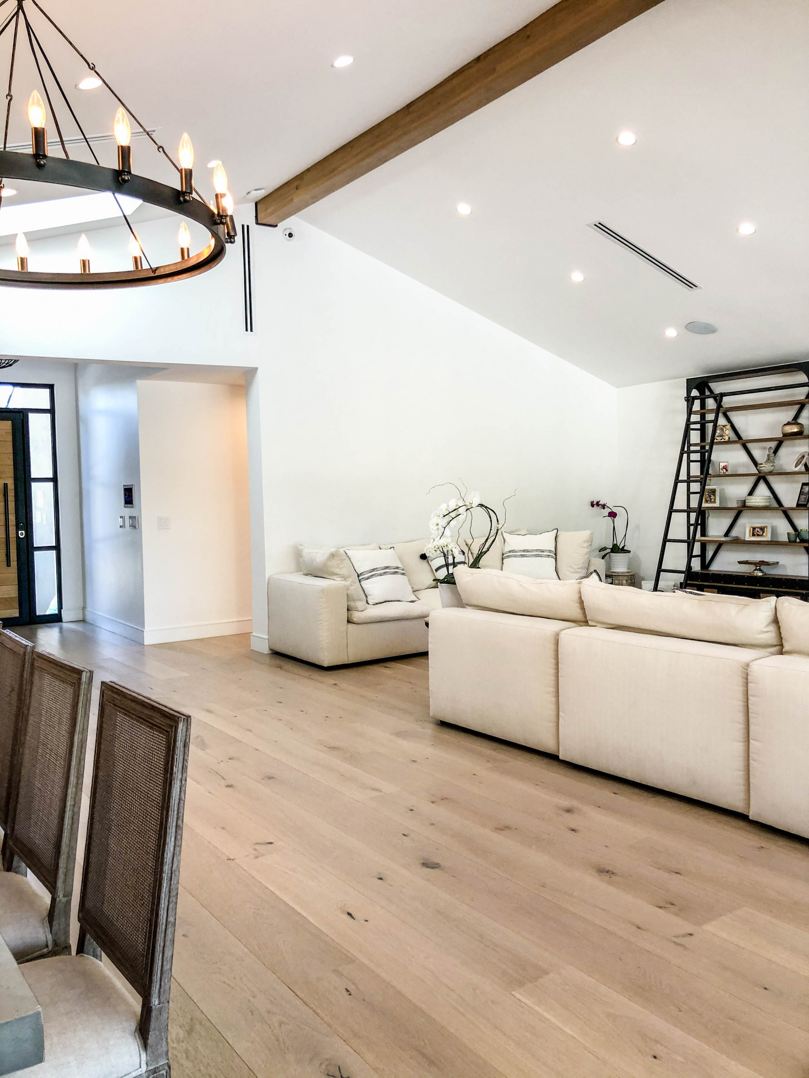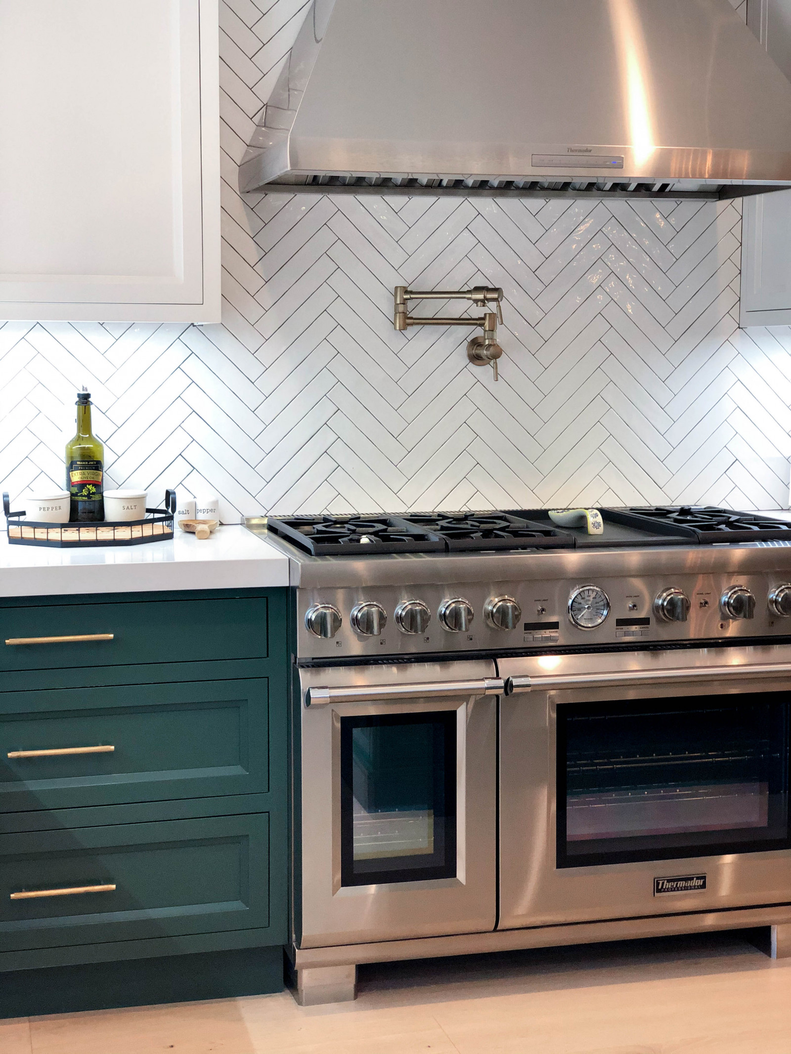 Interior remodel for a home in Los Altos. We installed vinyl flooring, interior paint, wood beams for the high ceilings, and added recess lighting. We installed custom-designed shaker cabinets in the color midnight green with champagne hardware, new vinyl flooring, quartz countertops, herringbone backsplash, recess lighting, a custom island featuring bar seating and additional storage space.