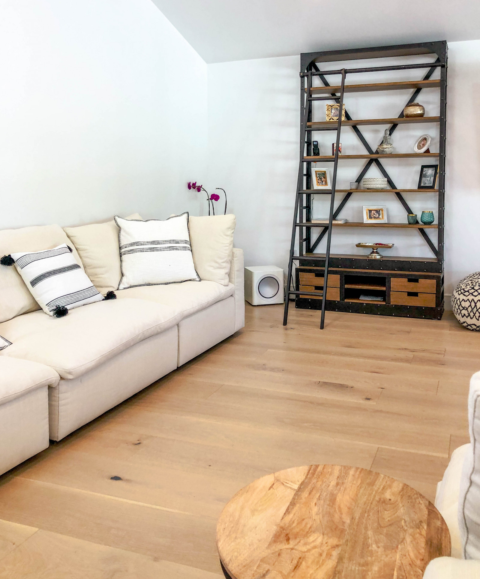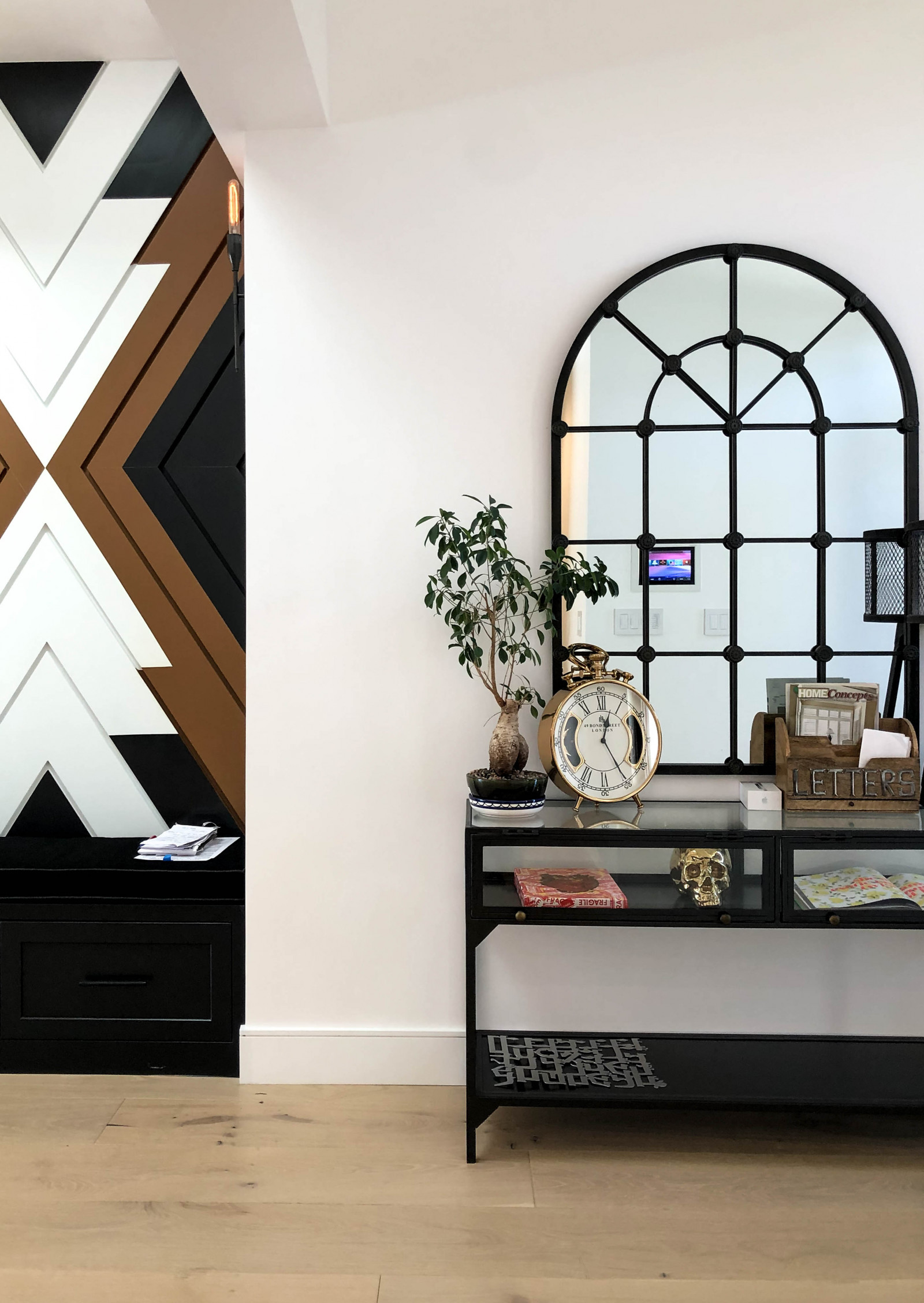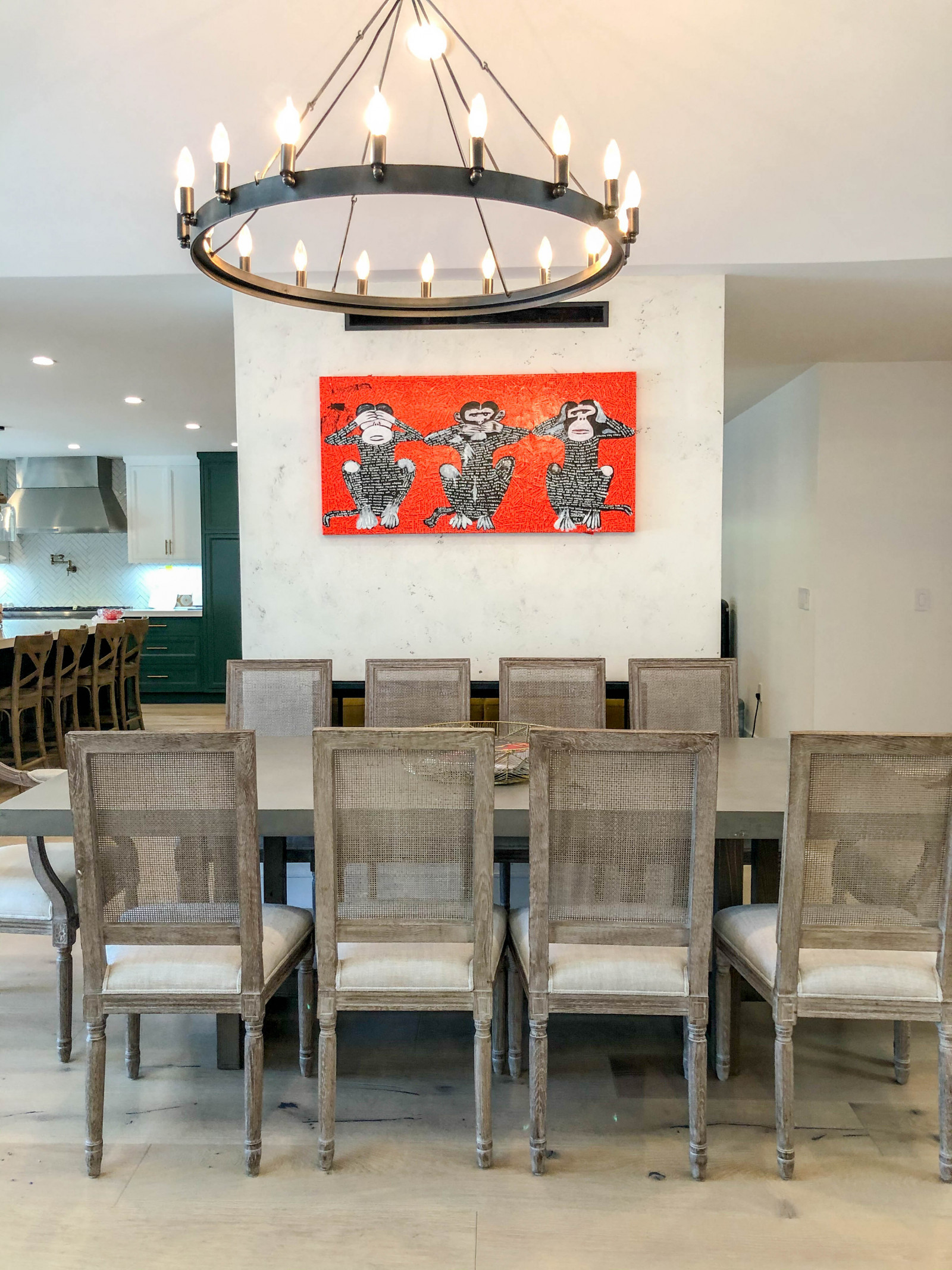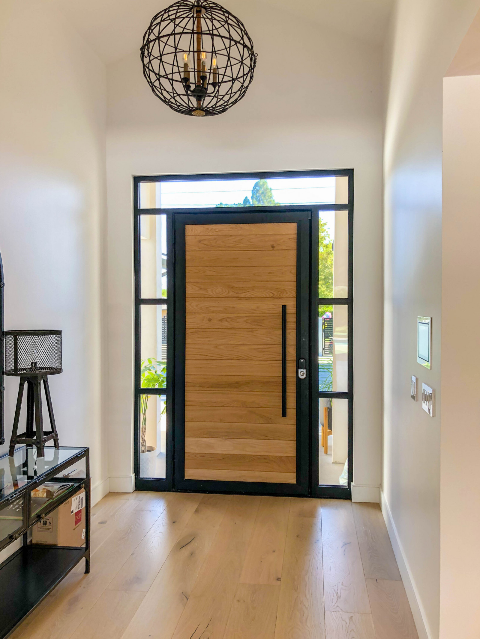 Interior remodel for a home in Los Altos. We installed vinyl flooring, interior paint, wood beams for the high ceilings, and added recess lighting. We installed custom-designed shaker cabinets in the color midnight green with champagne hardware, new vinyl flooring, quartz countertops, herringbone backsplash, recess lighting, a custom island featuring bar seating and additional storage space.